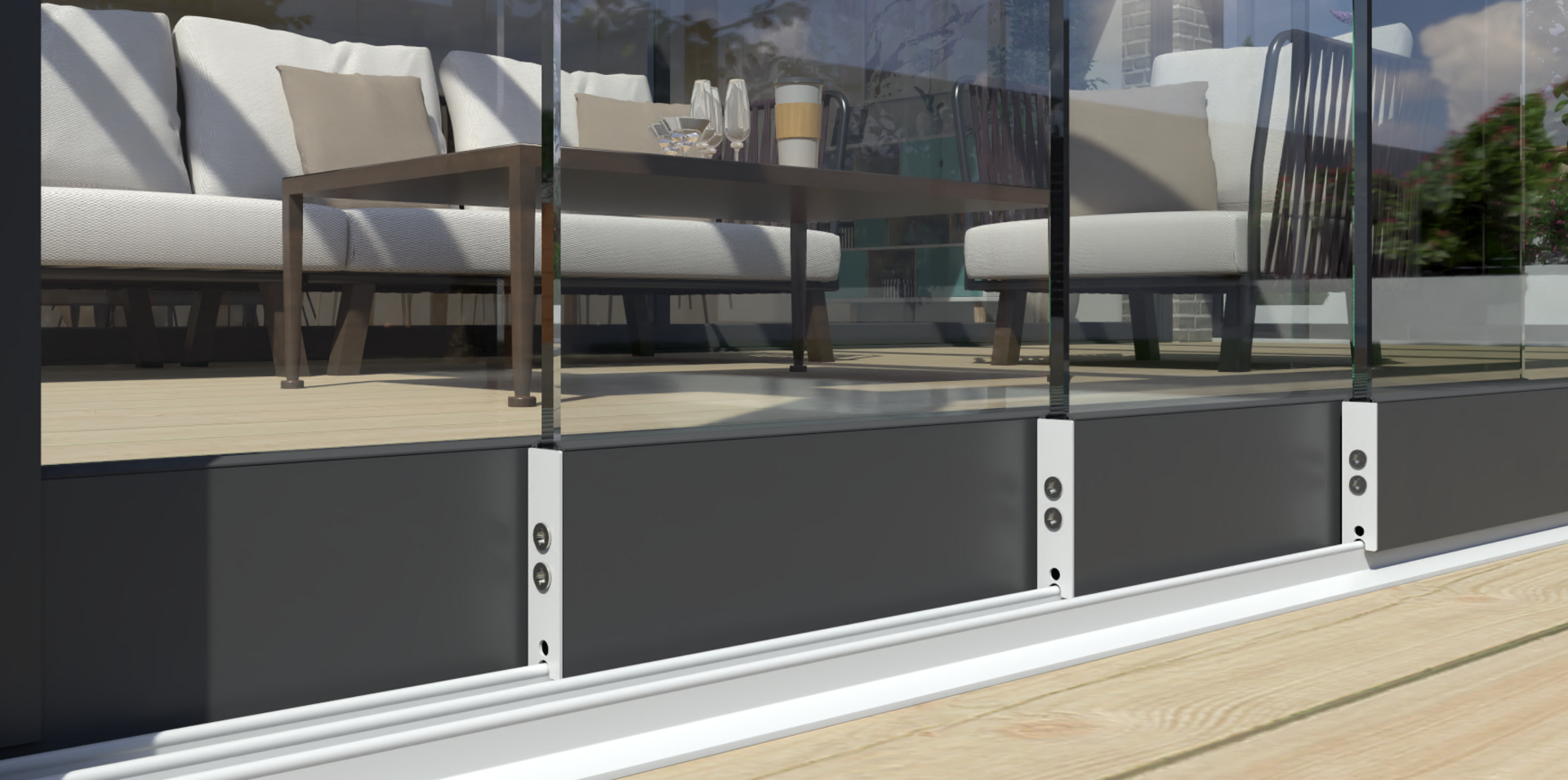Für das einfache Schließen Ihrer Anlage bieten wir zusätzliche Edelstahl-Mitnehmer-Sets an. Sie müssen lediglich an einer Scheibe ziehen und nehmen automatisch alle nachfolgenden Felder mit, bis Ihre Anlage vollständig geschlossen ist.